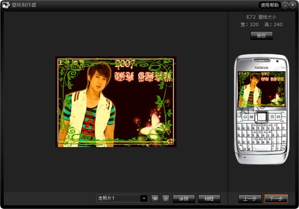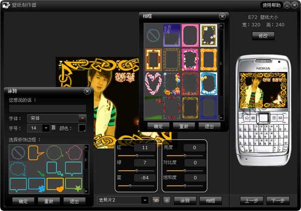 接下来到了最喜爱的环节了,就是你可以随心所欲的打造你想要的壁纸哦~首先你可以用下方工具栏中的影楼风格为你的照片调效果,旁边的可以调颜色度、和明暗度等,还有涂鸦栏可以输入要显示在壁纸上的文字方式,还可以添加精美的相框,如图