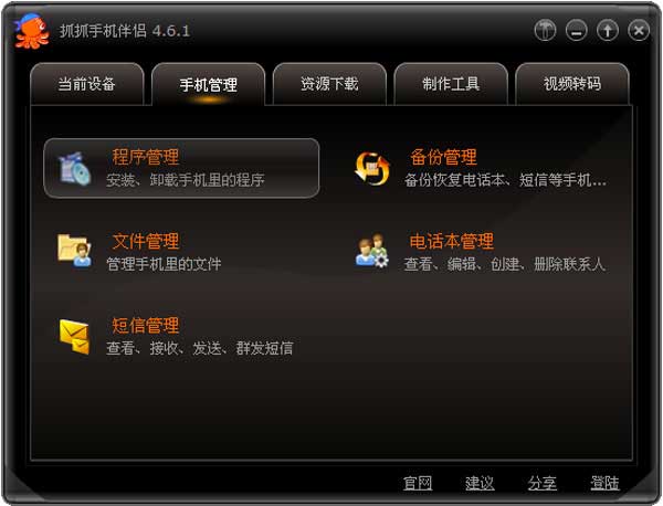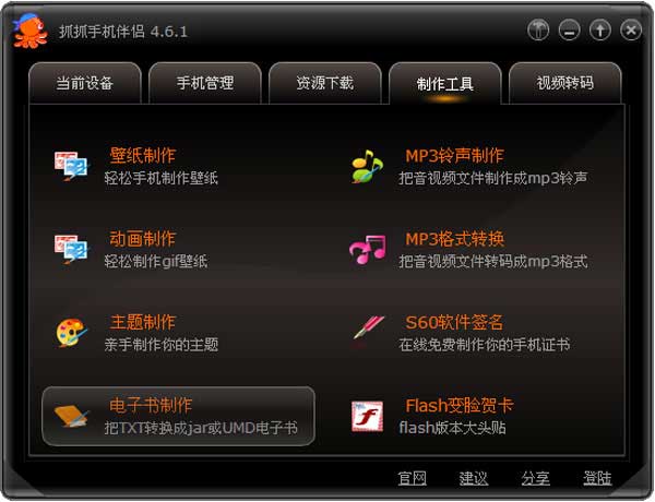 抓抓手机伴侣是一款为手机、MP4提供智能管理、资源下载、多媒体制作的PC软件。当然这款软件的功能可远不止这些哦!今天小编就教大家如何使用抓抓手机伴侣进行视频转码、制作铃声、壁纸、电子书,下面一起来学习下吧!