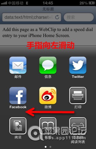 第五步:如果你的手机是iPhone5则会出现下图界面,请用手指向左滑动界面,即看到【添加到主屏幕】的按钮