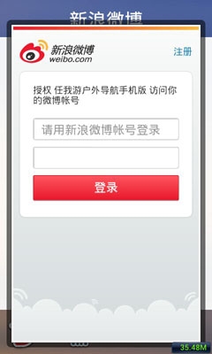 第四步:如果我们想进行照片微博分享,我们可以点击微博分享按钮,首先软件会提示通过新浪还是腾讯微博进行分享。我就拿新浪微博分享吧,点击新浪微博,弹出一个授权对话框,需要将你自己的新浪微博账户和密码输入好登录即可进行微博分享。进入照片分享,我们可以将自己想要说的话输入到输入框中,然后点微博分享按钮,这样一张带有GPS信息的照片就被分享到微博上了。如下图所示: