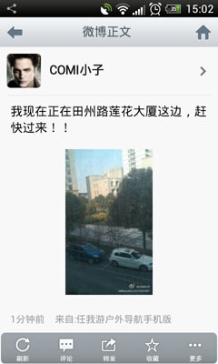 另外我们分享到微博上的照片,同样也可以将通过微博保存到你手机上,再次进行照片导航。方法很简单,只要你手机也同样装有任我游户外导航软件,那么只要打开手机微博,将我刚才刚分享的微博照片查看原图并保存到手机上,接下去,我们将保存的照片找到并拷贝到Gou目录下的“来自分享”文件夹里,然后再打开导航软件,进入到照片导航打开来自分享,就能够看到我刚从微薄上保存下来的照片,并且更加神奇的事,这张照片也可以进行照片导航。如下图所示: