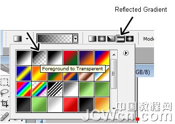 新建文件。新建图层。选择渐变工具,选择从前景到透明的渐变,选对称渐变(Reflected Gradient),如下图:
