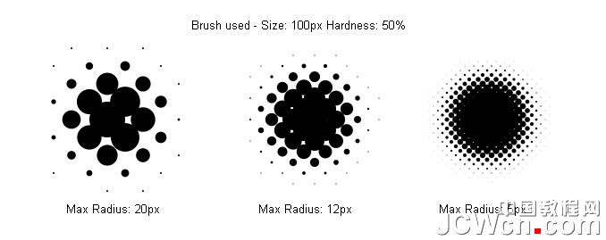 半径值越小,半调图案中的圆点就越小、越多。下图显示的是大小100像素、硬度为50%的画笔在最大半径值分别为20像素、12像素和5像素时制作出来的半调图案。