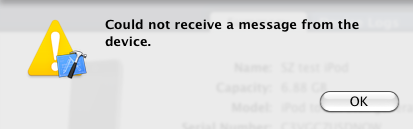 2.插入iPod,弹出“Could not receive a message from the device.”警告消息框如下: