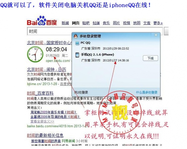 大家只要安装这个软件,你的手机不用下载任何软件,当然你原来的安卓版本QQ也不删照常登录,不过登录的时候要隐身,隐身了别人看你还是iphoneQQ在线的,如果你上线的话就还是安卓QQ在线的,只要用电脑下载个软件就行了。还有就是你的QQ密码不能更改,如果更改了就会掉,是永久iphoneQQ在线哦。