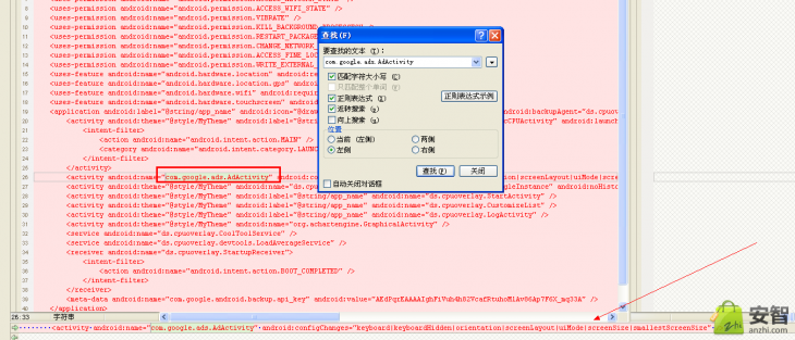 进入AndroidManifest.xml按ctrl+F搜索搜索谷歌com.google.ads.adactivity【这个是admod的标准广告格式】