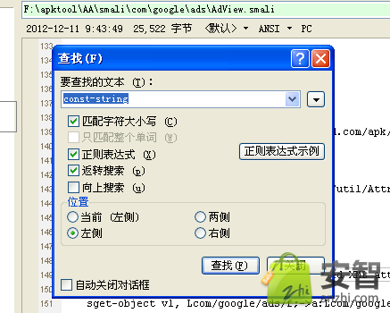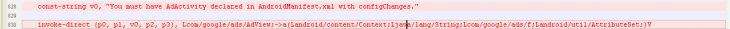 接着进入F:\apktool\AA\smali\com\google\ads\AdView.smali我们只要找到刚刚在AndroidManifest.xml删的广告代码和在这的对应广告代码删除。