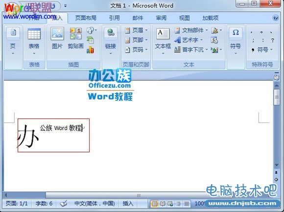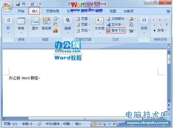 1、打开Word2007,输入部分文字,然后点击菜单栏--插入,点击文本里面的首字下沉。
