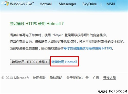 2、登录成功后,会询问你是否尝试通过HTTPS使用Hotmail,我们可以在两个选项中任选其一。这里我们选择“继续使用Hotmail”选项。