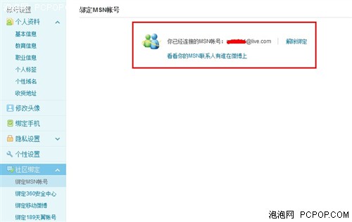 3、进入“账号设置”页面后,在左面一栏中找到写有“社区绑定”字样的区域,并选择“绑定MSN账号”,在右边的页面中即会出现“立即绑定”按钮,点击该按钮。