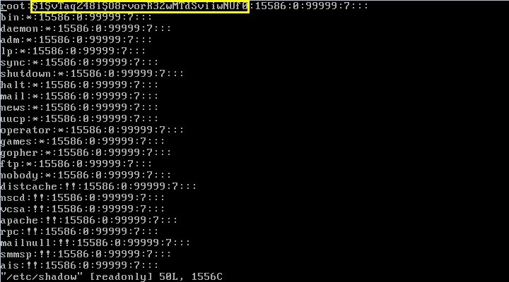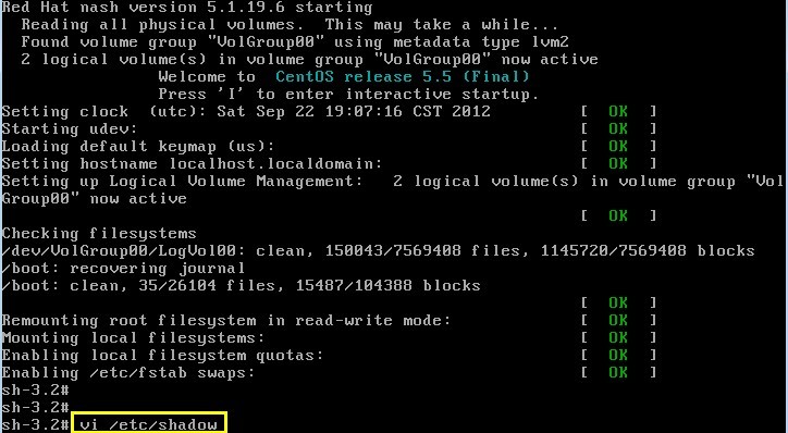 输入完成后,回车。此时返回到之前的页面,光标会定位在第二行kernel,再按B(启动),稍等一会会启动到如下界面, 输入 vi /etc/shadow (编辑shadow)
