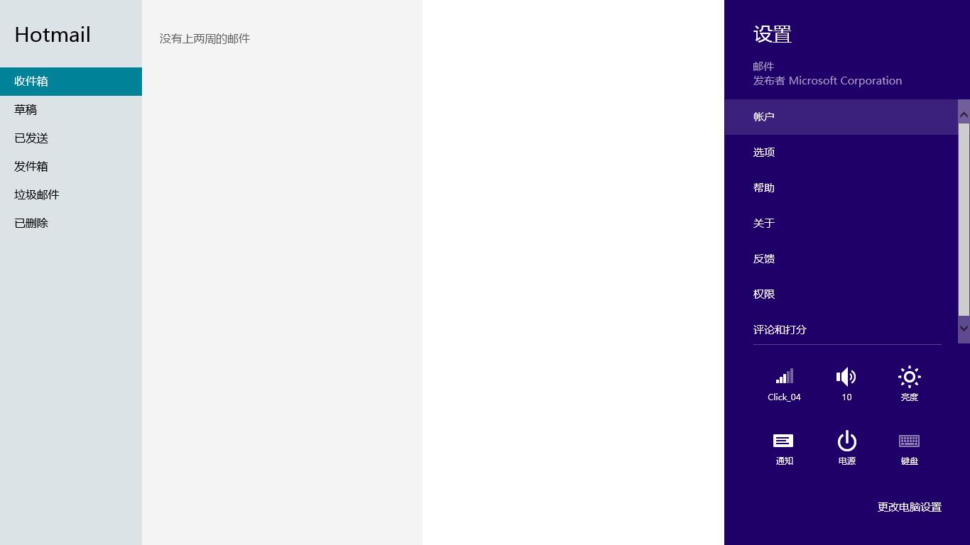 这两种类型账户的添加方法大同小异,首先需要将鼠标移动到右上或者右下角,在侧边超级按钮中单击“设置”,再单击“账户”。