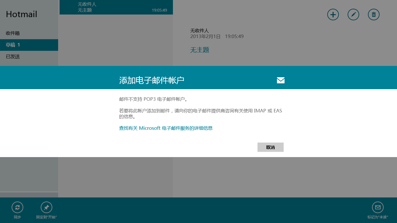 Windows 8邮件应用在列表中提供了Exchange Activesync(EAS)、IMAP和POP三种类型账户,但是实际上POP账户是无法成功添加的。