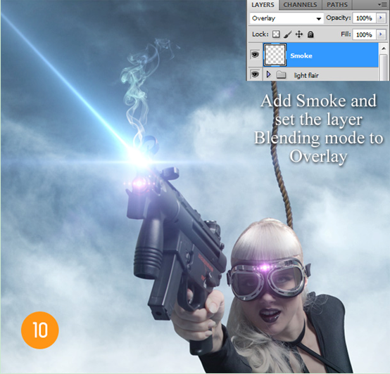选择烟雾笔刷,并设置透明度为100%,颜色为白色,然后涂在枪的激光点上