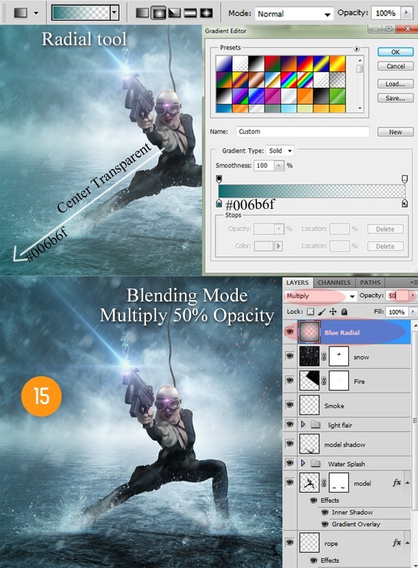 在整个图像中添加径向梯度(中心透明,边界#006b6f)现在设置它的混合选项为“正片叠底”然后将透明度降至50%