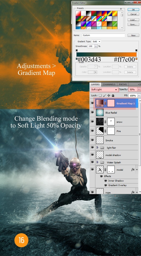 到“调整”面板然后选择“渐变映射”,设置渐变颜色从#003d43到#ff7c00。现在改变混合模式为“柔光”并将透明度减少为50%