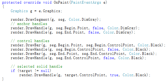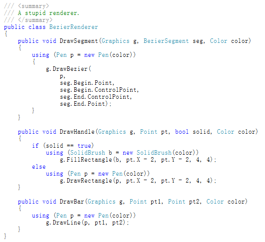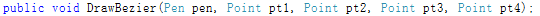 幸运的是,GDI+已经封装好了贝塞尔曲线的绘制代码,如果你想画出贝塞尔曲线,只用调用Graphics.DrawBezier方法: