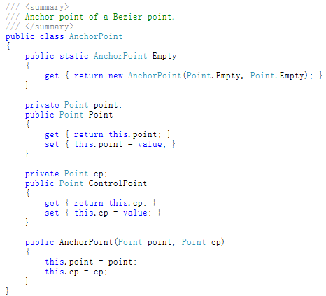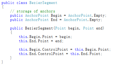 对于三次贝塞尔曲线而言,有两个锚点:起始点和结束点。每个锚点有两个坐标:本身坐标和控制点坐标。于是,可以用这样的类来描述: