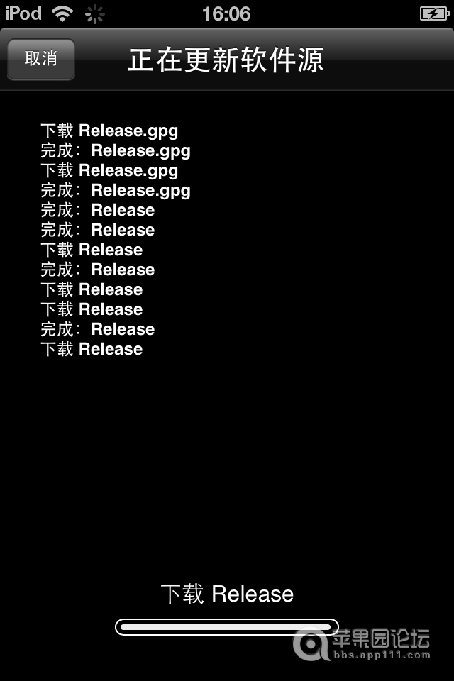 6、此时耐心等待几分钟,若发现Cydia源长时间卡在下图这个界面,手动点击左上角取消按钮即可。