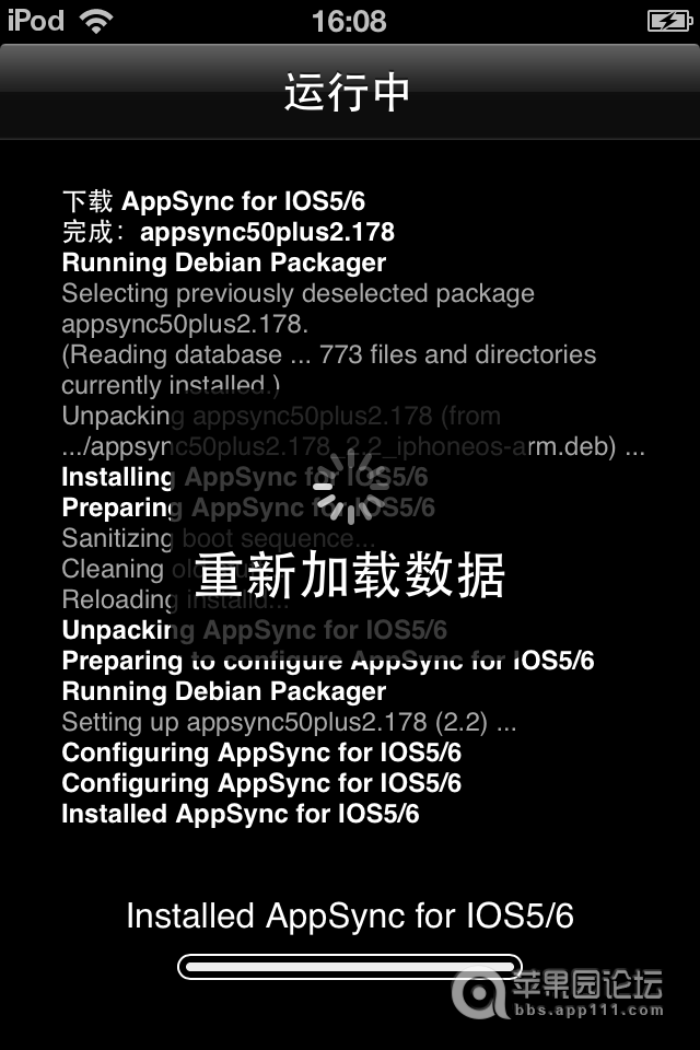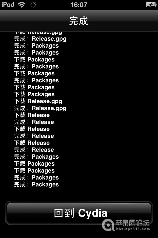 7、点击取消按钮后,Cydia会提示重新加载中,等待加载完成后如下图点击回到Cydia。