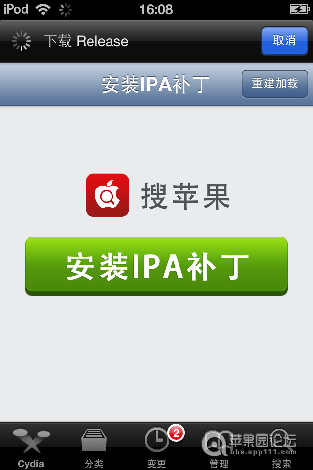8、回到Cydia后,界面会变成如下图所示,我们直接点击中间安装IPA补丁按钮。
