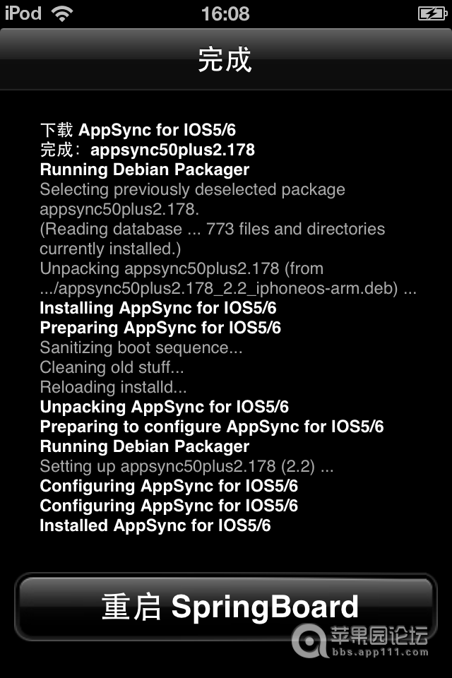 11、安装完成后Cydia会提示你重启界面,点击重启。