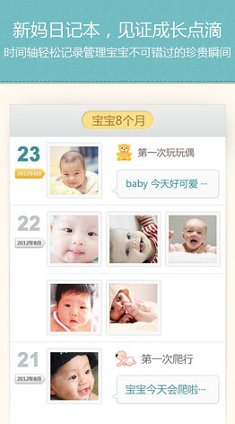 除了宝宝的每个瞬间值得记录,宝宝的每段成长经历也是非常值得珍藏的。亲子相机不仅能帮宝宝记录每个纯真瞬间外,还可以用声音视频来记录宝宝的每段成长,譬如学会说话,学会走路。总之,亲子相机就是一本用照片、有声视频记录宝宝从出生到成长的珍贵时刻的日记本,同时可支持多个宝宝哦!每个宝宝可以有独立的日记本。