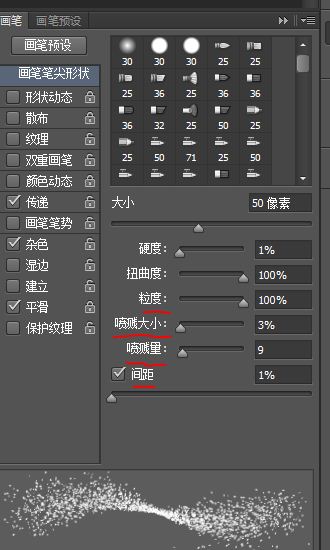 有的童鞋可能会问为什么我的画笔、设置里面没有传递的那个选项的,也没有颗粒,喷溅大小等等的呢?