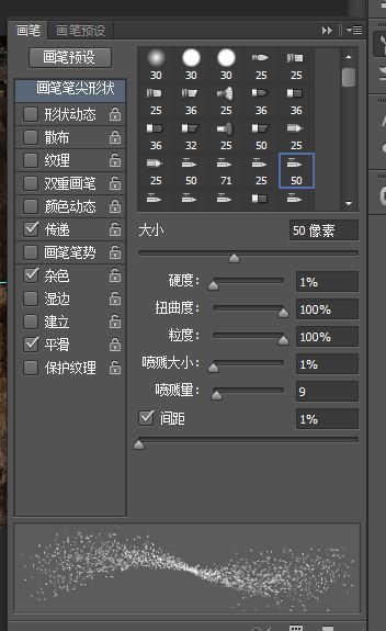 其实传递和杂色可以不用,如果,没有颗粒,喷溅大小没有那应该是大家的PS版本过低吧!