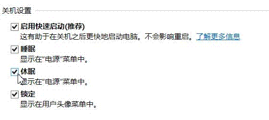 解锁之后,将该窗口下方“关机设置”里的第三项“休眠,显示在‘电源’菜单中”选中,最后点击“保存修改”退出。