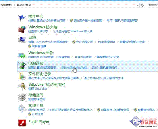 进入“系统和安全”分类,点击“电源选项”一栏的“更改电源按钮的功能”;