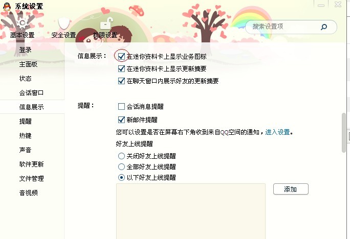 然后再点击“基本设置”里的“信息展示”,将“在迷你资料卡上显示业务图标”前面的勾勾打上,这样就设置成功啦!