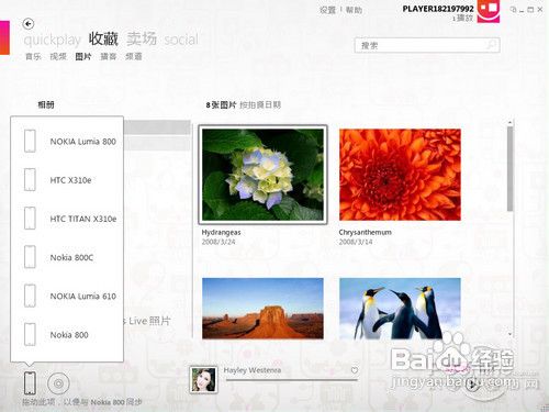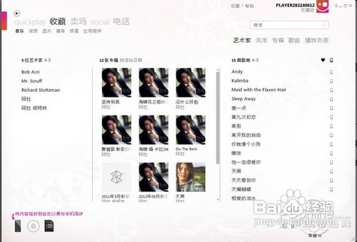 安装Zune之后,将WP7手机与电脑连接,软件会自动启动,点击程序界面左上角选项中的“收藏”,在其下会出现“视频”、“音乐”、“图片”等选项,下面以音乐为例说明同步方法。