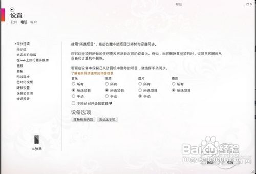 如果需要同步的文件不多,我们大可以手动拖曳完成,可是如果有200首歌600张图片,虽然支持多选,但是也未免过于麻烦,所以,唯一的解决是寻求自动同步的办法。进入设置,在“设置”下面选择“电话”,第一项就是同步方式的设置,在各文件类型下都有“全部”、“所选”及“手动”三个选项,如果你要让它与手机全自动同步,那选“全部”即可,不过需要注意的是,在这种同步方式下,你在电脑上如果删除了库中文件,只要连接手机,那手机中相应内容也会被删除。