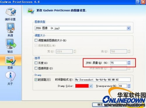 Gadwin PrintScreen图像保存格式支持bmp、jpg、gif、png、tif五种格式,jpg格式还支持jpeg质量设置,其它四种格式不支持,质量建议设置为100%这样截出的图很清晰。图像大小设置在截取图像较多并需要修改大小时使用,图像较少时并不是很方便。另外Gadwin PrintScreen还可以给截取图像加上时间戳,例如系统默认的My Screenshot: %m-%d-%y %H:%M:%S,图像截取后显示的时间戳就是My Screenshot 05-05-11 10:50:44,如图(9)所示: