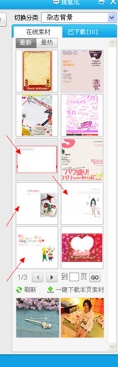一个推荐背景栏,找一个有白色部分较多的背景图,像我用箭头指定的图片都可以。点一个之后,把整个圆拖到纯空白处,像这样:
