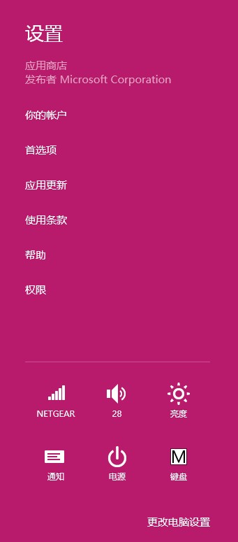 从屏幕右边缘向中间轻扫,调出charm,然后点击“设置”。