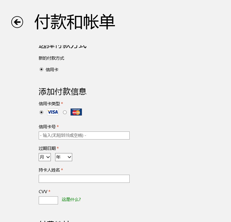 目前应用商店支持的付款账户支持信用卡,而且只有visa和master两种,如图所示::