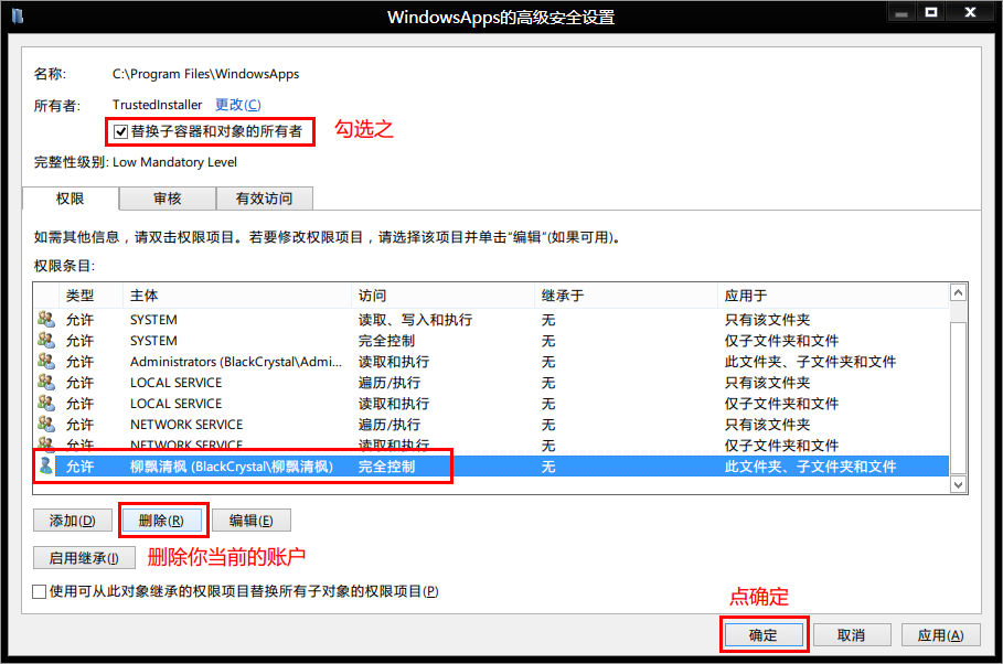 2. 然后勾选下方的替换子容器和对象的所有者,并删除当前账户,然后点确定,该文件夹会重新授权,授权完毕会回到默认权限~