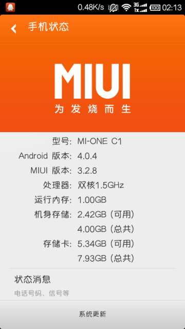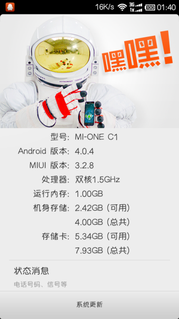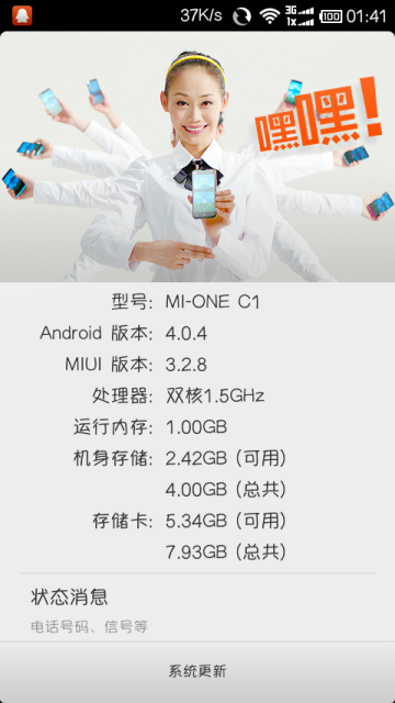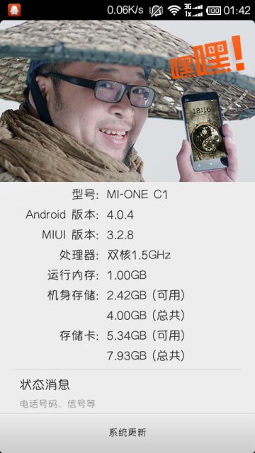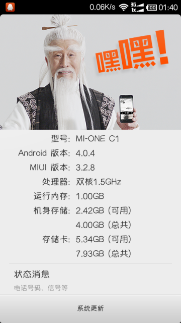 今天无意间在查看系统信息(关于手机)里乱滑了一下,尼玛,“嘿嘿”!!!好吧,我承认又被吓了一跳,囧!查看系统信息界面的橙色部分就变成了小米春晚广告里的人物,见下图。