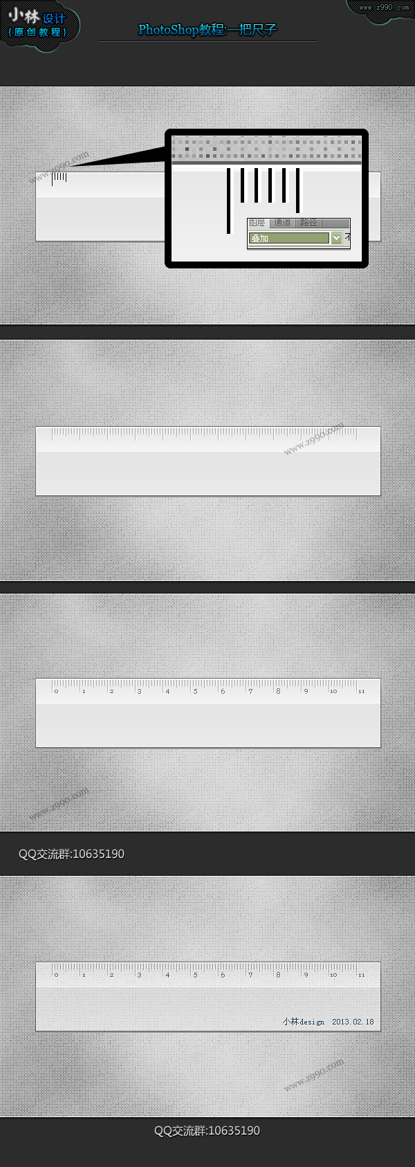 6,绘制尺子上的刻度,绘制黑线,白线各一条。更改图层模式为叠加,如图所示;