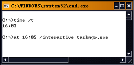 3. 输入 at 16:05 /interactive taskmgr.exe 命令,这样2分钟后就可启动运行任务管理器(图1)。