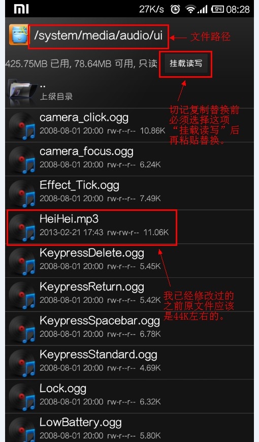 system/media/audio/ui,在这下面你会找到”HeiHei.mp3“文件,对了,这个就是”嘿嘿“的声音文件。