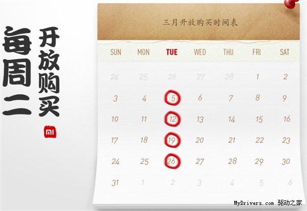 从小米官方公布的信息来看,小米手机以后开放购买的时间被调整到了周二,下一轮开放购买的时间则是3月份的第一个周二,也就是3月5日。