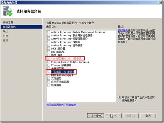 (1)在Windows Server 2008中,添加角色“Web服务器(IIS)”及“打印服务”,如图1-1所示。