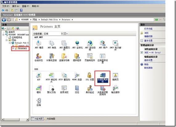(2)安装之后,打开“Internet信息服务管理器”,发现添加了一个名为“Printers”的虚拟目录,该目录保存在“c:\windows\web\printers”中,如图1-2、图1-3所示。
