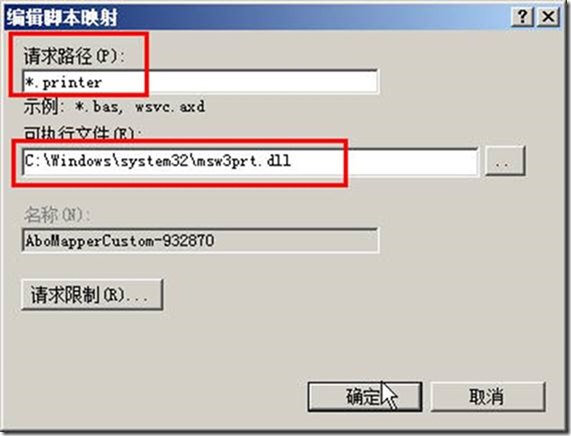 (9)在“请求路径”处输入*.printer,可执行文件处输入c:\windows\system32\msw3prt.dll,名称随意例如输入print,然后单击“确定”按钮,如图1-16所示。