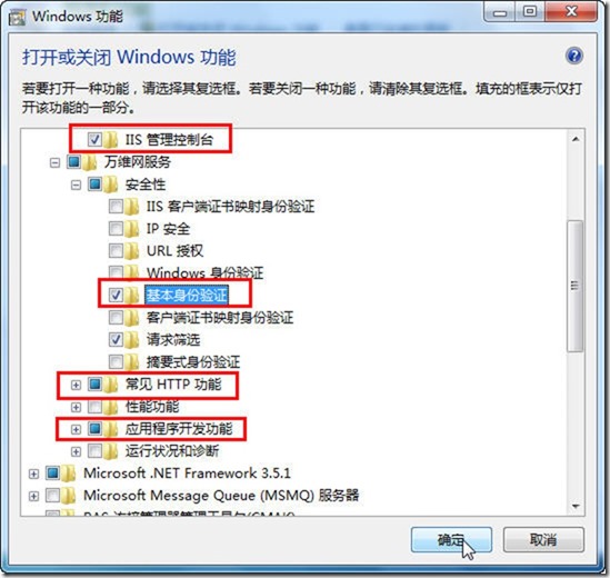 (2)在“打开或关闭Windows功能”对话框中,添加“IIS管理控制台”、“万维网服务→安全性→基本身份验证”、“常见HTTP功能”、“应用程序开发功能”组件,如图1-8所示。