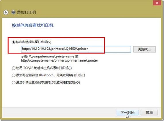 (3)在“按其他选项查找打印机”,单击“按名称选择共享打印机”,输入图1-19中复制的打印机的网络地址,本示例为“http://10.10.10.102/printers/LQ1600/.printer”,然后“下一步”按钮,如图1-24所示。