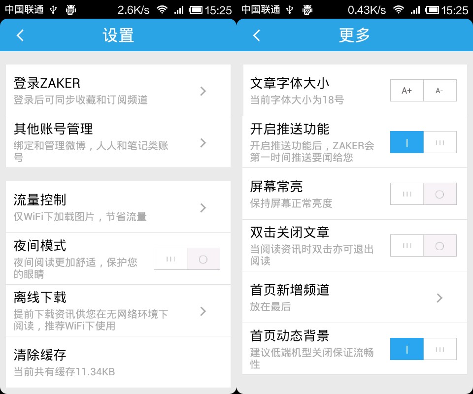 对于用户阅读习惯, ZAKER也提供了人性化的设置项,比如,屏幕亮度调整、双击关闭文章、正字大小、开启推送功能等。而对于用户最关心的流量的问题,ZAKER也提供了全图片、仅文本、智能模式三种解决方法,通过文章内容的显示方式,达到控制流量的目的。